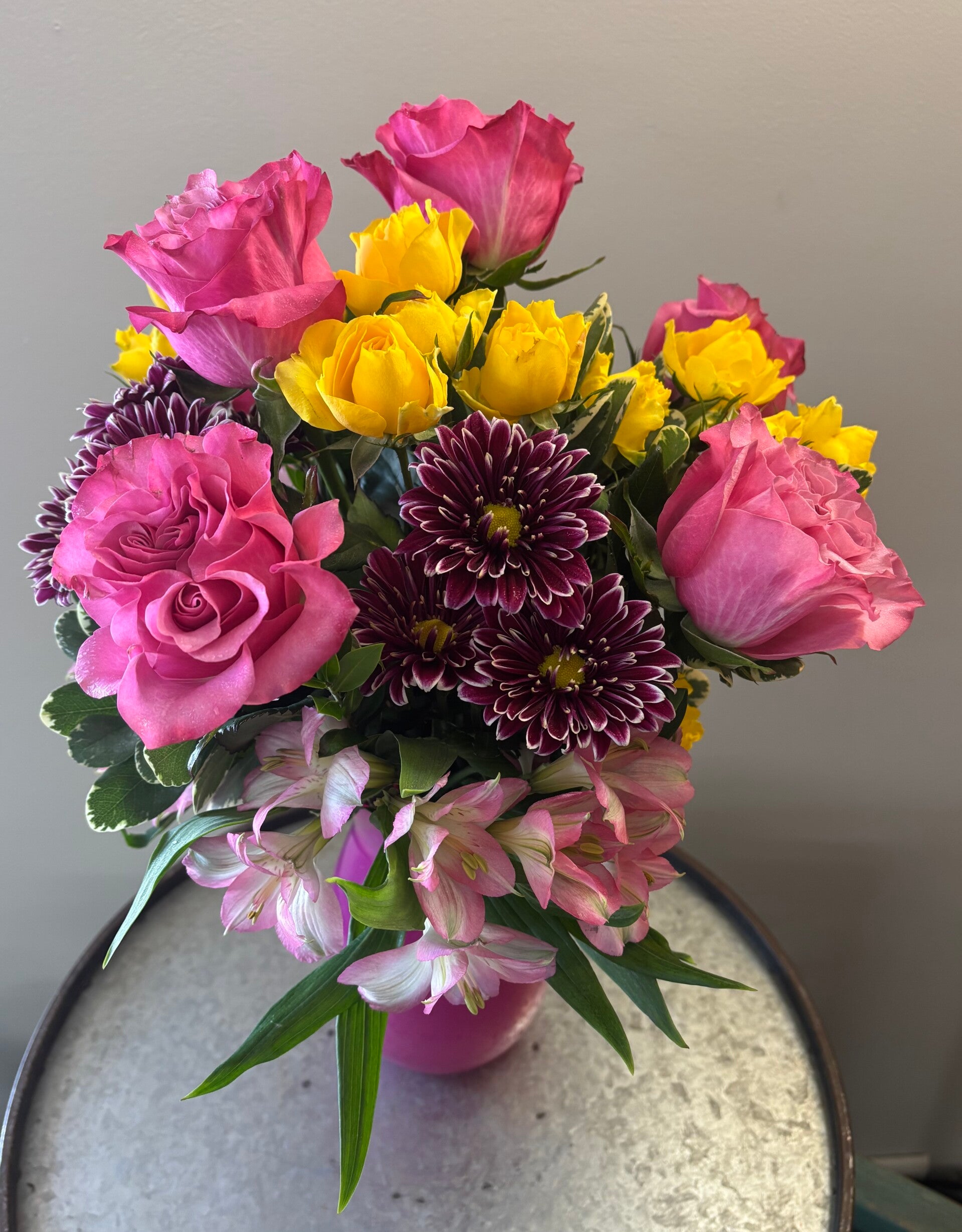 A beautiful 6 rose bouquet, filled with bright colors of designer's choice.